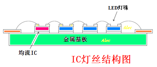 IC 燈絲是直接將恒流IC 芯片綁定在燈絲基板上,恒流IC 在燈絲基板上與N顆LED 燈珠芯片直接串聯(lián)成一體,成為有自控燈絲電流的新型電子LED 燈絲。