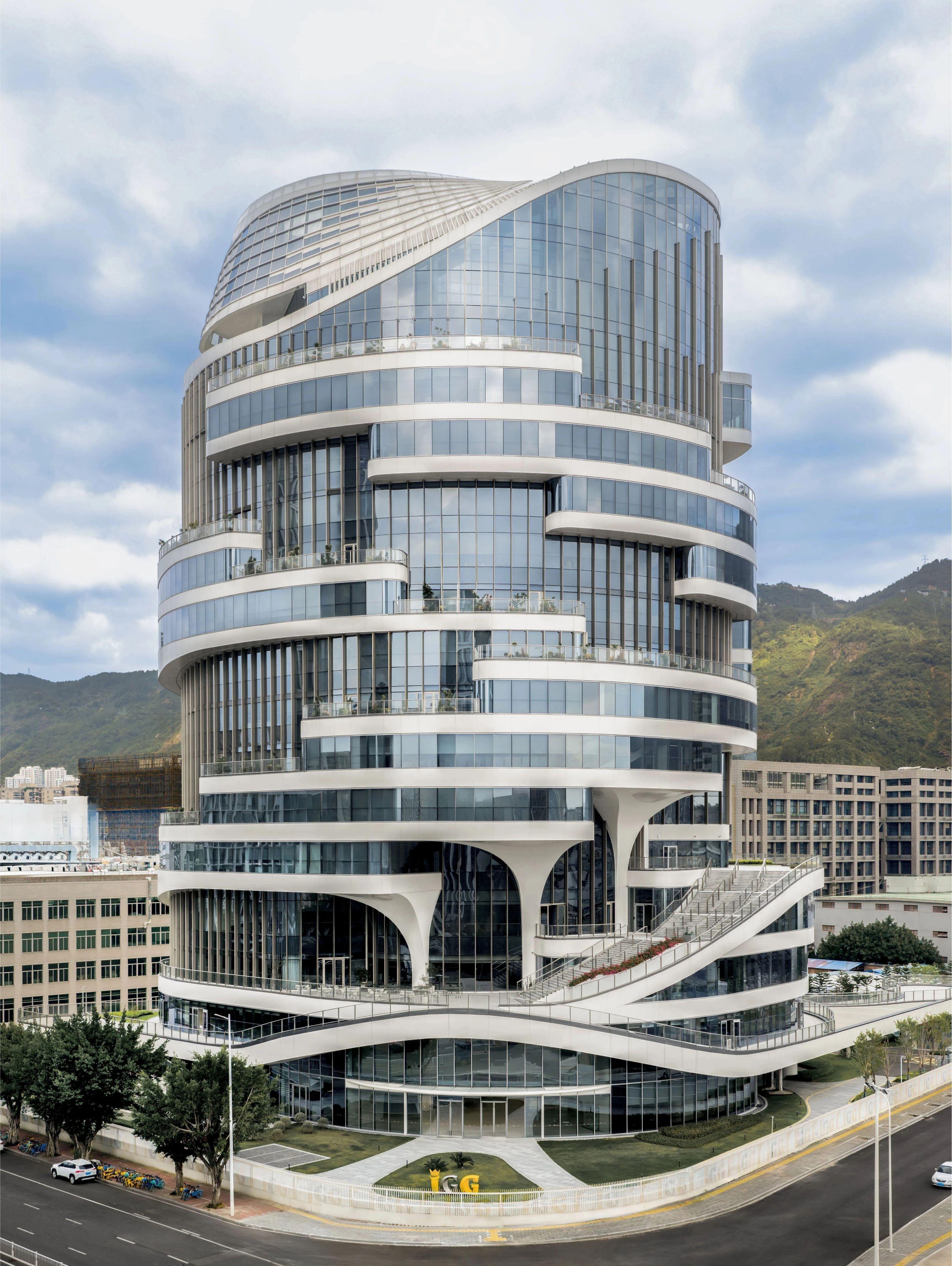 建筑設(shè)計(jì)以“神奇榕樹屋” 為核心靈感,深度融合福州的市樹文化與科幻風(fēng)格的流暢曲面。核心筒如同榕樹深扎大地的堅(jiān)實(shí)主干,為建筑奠定穩(wěn)固根基;層層疊疊的露臺(tái)恰似向陽舒展的繁茂樹冠,線條流轉(zhuǎn)間盡顯生機(jī)與靈動(dòng)。燈光設(shè)計(jì)與建筑設(shè)計(jì)理念深度呼應(yīng),以光為筆、與建筑共生,生動(dòng)詮釋了 IGG 團(tuán)隊(duì)與時(shí)俱進(jìn),不忘初心的精神內(nèi)核。