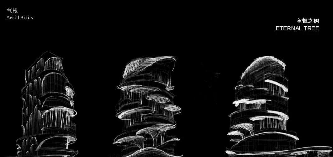 建筑底部的雙曲面弧形結(jié)構(gòu),在底部燈光的溫柔包裹下,宛如榕樹主干中奔涌的生命脈絡(luò),傳遞出蓬勃向上的生命力,為建筑奠定溫暖而堅(jiān)實(shí)的視覺基調(diào)。